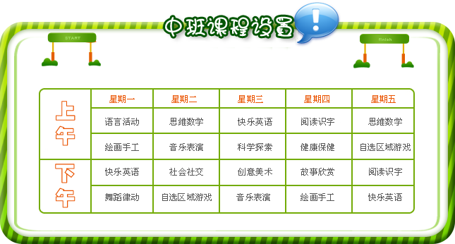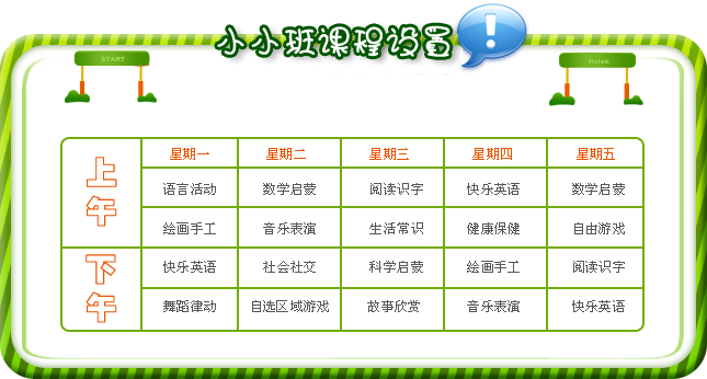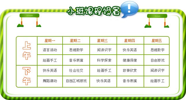 结合幼儿园指导纲要?对幼儿综合素质教育的要求,综合教育活动时间每周五天分别安排五大领域健康、社会、科学、语言、艺术这五方面的教育内容。教师根据本班幼儿实际情况设计教学计划,教学计划要适合各年龄段的儿童的发展水平。 让孩子充分享受幼儿园的美好。